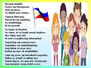 Ang binuhay na awiting Bayan Ko ni Freddie Aguilar mula sa panulat ni JoseCorazon de Jesus ay ang pangunahing pumailanlang ngayon sa mga radyo at telebisyonAt dahil sa pagiging makasaysayan nito noong nakaraang matahimik na rebolusyon iminungkahi ngayon sa Constitutional Commission na gawin itong pangalawang Pambansang Awit ng. Maputi malinis maganda maningning Ang lahat sa langit nainggit sa akin. Ang Lupang Hinirang ay ang pambansang awit ng PilipinasAng himig nito ay ipinalikha ni Gen.