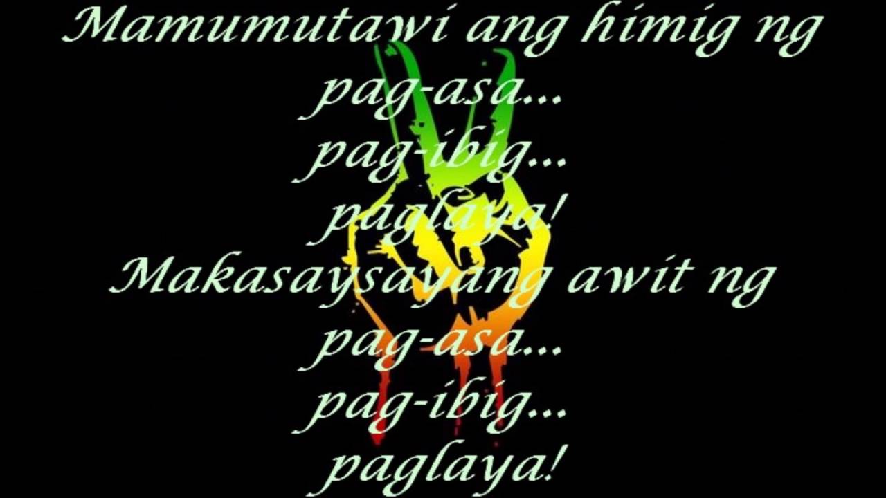 Sanay maintindihan Pag itoy dumating May bilin Mamumutawi ang himig ng pag asa Pag ibig paglaya Makasaysayang awit ng pag asa Pag ibig pag laya Ang musika sumasalamin sa damdaming maligaya Nagpapadama.