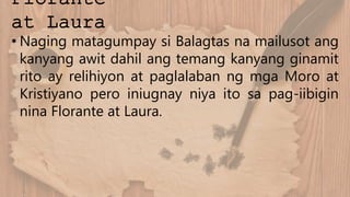 Pangkasaysayan ng Florante at Laura Florante at Laura Florante at Laura Isinulat ni Francisco Balagtas Baltazar noong panahon ng pananakop ng mga Espanyol sabansa taong 1838. Itinuturing ang Florante at Laura na pinakamahalaga sa lahat ng mga korido. Ang Florante at Laura ay.