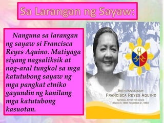 Kailangang kumabit tayo sa mga talent manager na may mga. Si Sarah Asher Tua Geronimo ipinanganak Hulyo 25 1988 ay isang mang-aawit aktres at modelong Pilipina. LARANGAN NG SAYAW FRANCISCA REYES AQUINO Sa larangan naman ng sayaw si Francisca Reyes Aquino na isang guro ang nangunguna sa paksang ito.