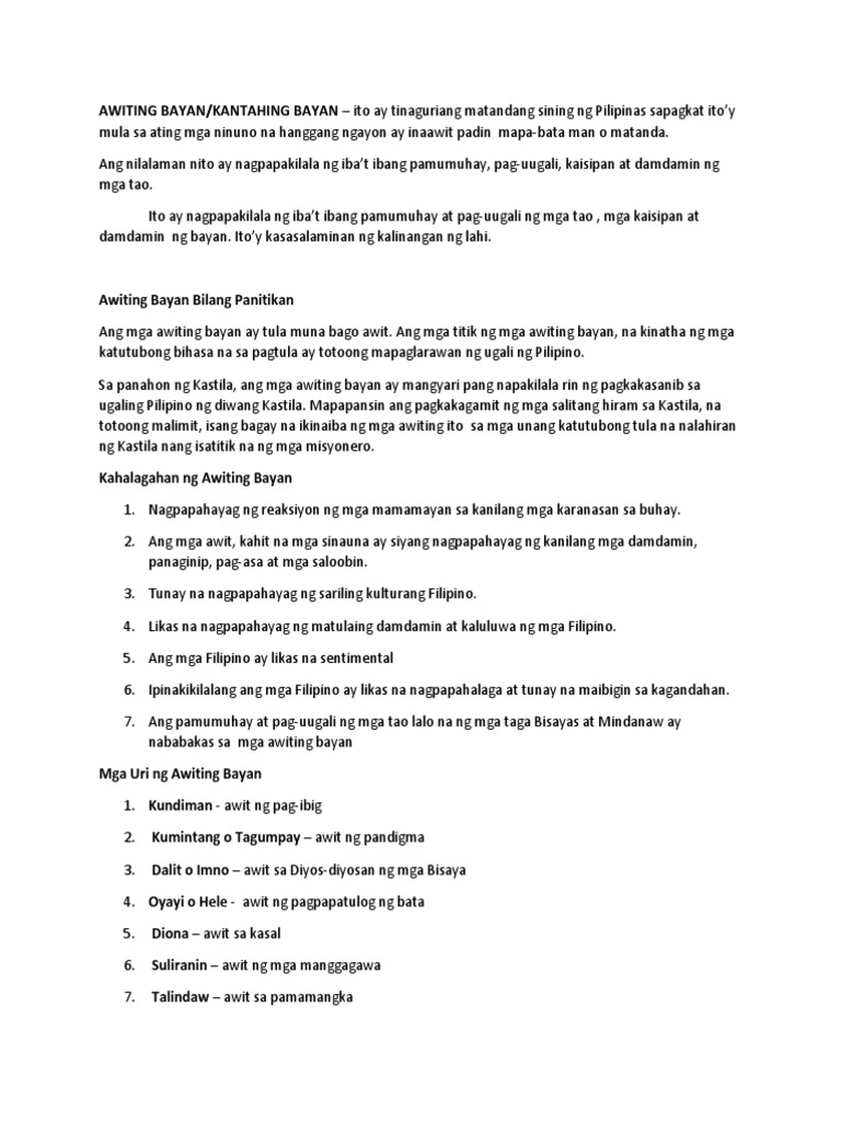Kundiman- ito naman sang bersyon ng mga awitin ng pag ibig sa mga Tagalog. Ang mga awiting bayan ay mga awiting Pilipino na kinakanta ng ating mga ninuno. Pagdulog sa Teoryang Pampanitikan.