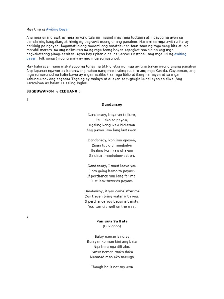 Inukukuwento ng kanta ang pamamaalam kay Dandansoy ngkasintahan na uuwi sa PayawGayunman binibigyan ng babae. Panimula Ang awiting bayan o tinatawag ding kantahing-bayan isang matandang uri ng panitikang Filipino ay awit ng mga sinaunang Pilipino na maging sa panahon ngayon ay inaawit pa rin. Kahulugan ng sayaw at awit.