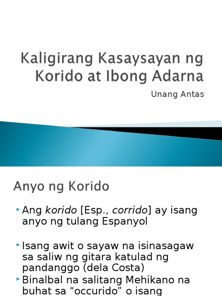 Be notified when an answer is posted. Unang Antas Ang korido Esp corrido ay isang anyo ng tulang Espanyol Isang awit o sayaw na isinasagaw sa saliw ng gitara katulad ng pandanggo dela Costa Binalbal. Hindi matukoy kung sino ang tunay na nagsulat ng akdang ito na naging malaking bahagi ng.