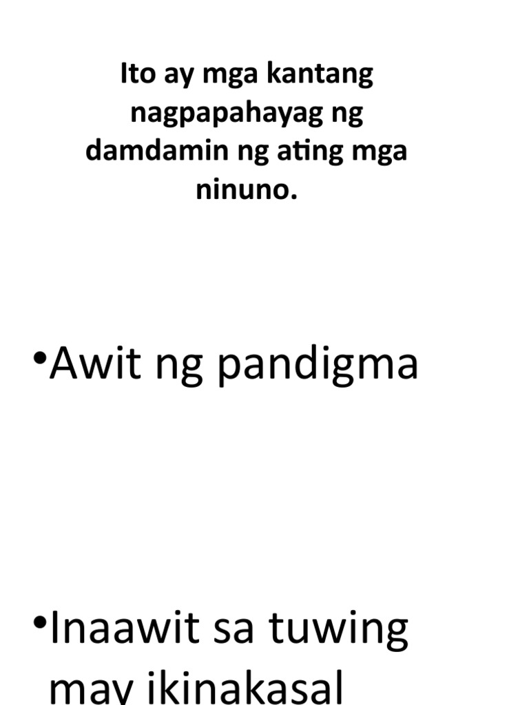 Halimbawa awit sa patay. Ang Kundiman ay awit sa pag-ibig. Sige anak kong mahal Bumangon ka. Make up the dead.