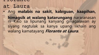 Florante at Laura AWIT Kwentong katha-katha lamang Lalanbindalawahing pantig at kung basahin ay paawit Isang awit ang Florante at Laura batay sa sumusunod na mga matuwid. Ang kompletong pamagat ng akda ay Pinagdaanang Buhay ni Florante at Laura sa Cahariang AlbaniaQuinuha sa Madlang Cuadro Historico o Pinturang Nagsasabi nang manga nangyayari nang Unang Panahon sa Imperio nang Greciaat Tinula nang Isang Matouain sa Versong. Sa akdang ito ni Kiko may nakapaloob na apat na himagsik.