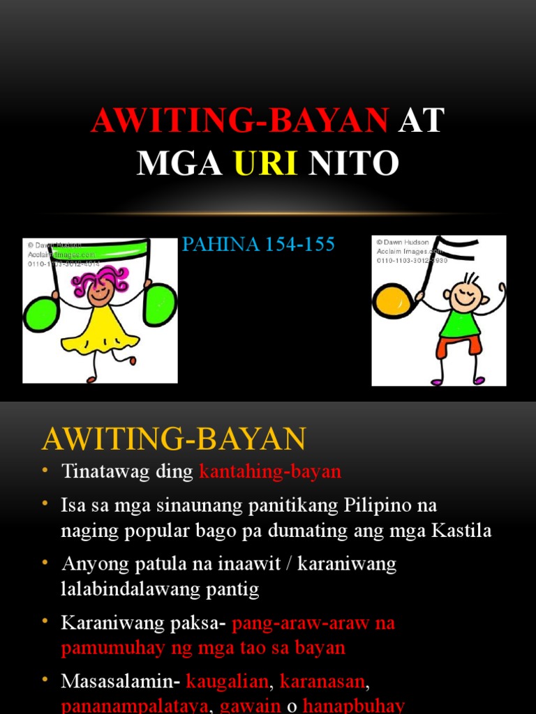 Ang mga awiting bayan ay mga sinaunang awitin ng ating mga ninunong Pilipino. Start studying Ibat ibang Uri ng Awiting Bayan sa Pilipinas. Nakabilang dito ang ritmo at metro o meter na kung saan ang ritmo ay.