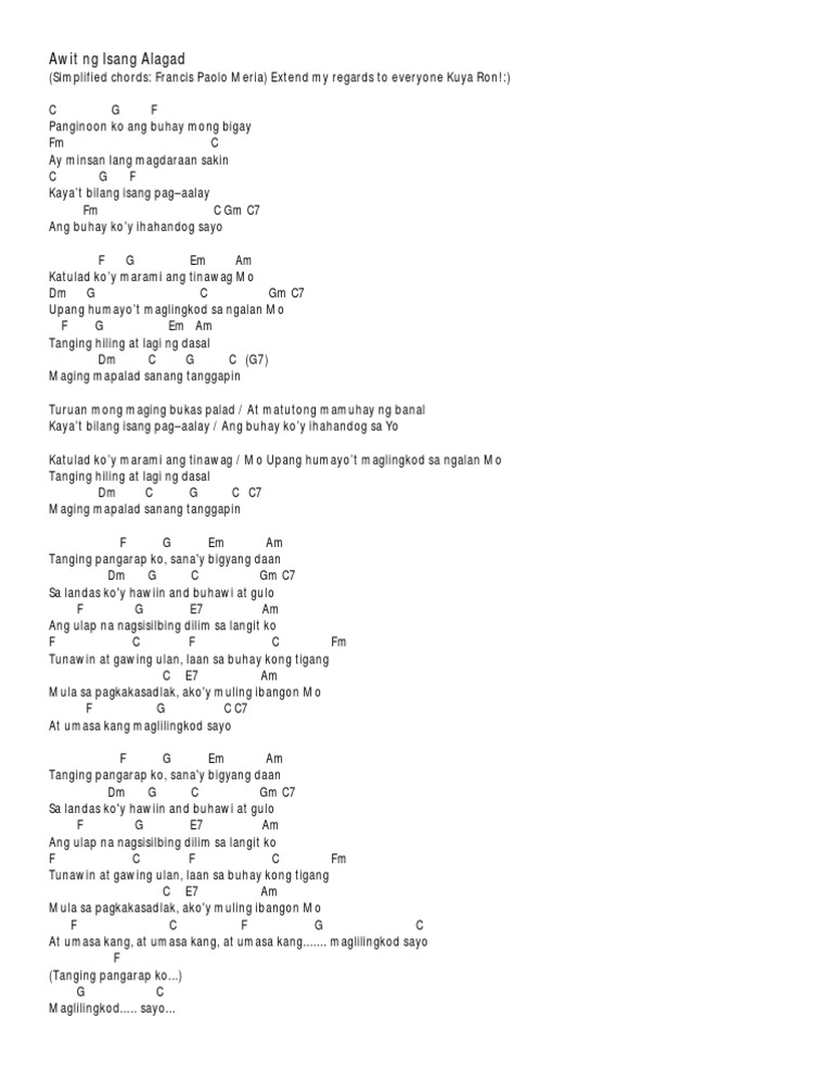 Iisang Panginoon iisang katawan Isang bayan isang lahi Sayoy nagpupugay. Awit Ng Isang Alagad Lyrics - Ronald Serran Christian Song Lyrics February 17 2017 Catholic Song Verse 1 Panginoon ko ang buhay Mong bigay Ay minsan lang magdaraan sakin Kaya bilang isang pag-aalay Ang itoy aking ihahandog saYo Chorus Katulad koy marami ang tinawag Mo Upang humayot maglingkod sa ngalan Mo Tanging hiling at lagi nang dasal. 10 for free and see the artwork lyrics and similar artists.