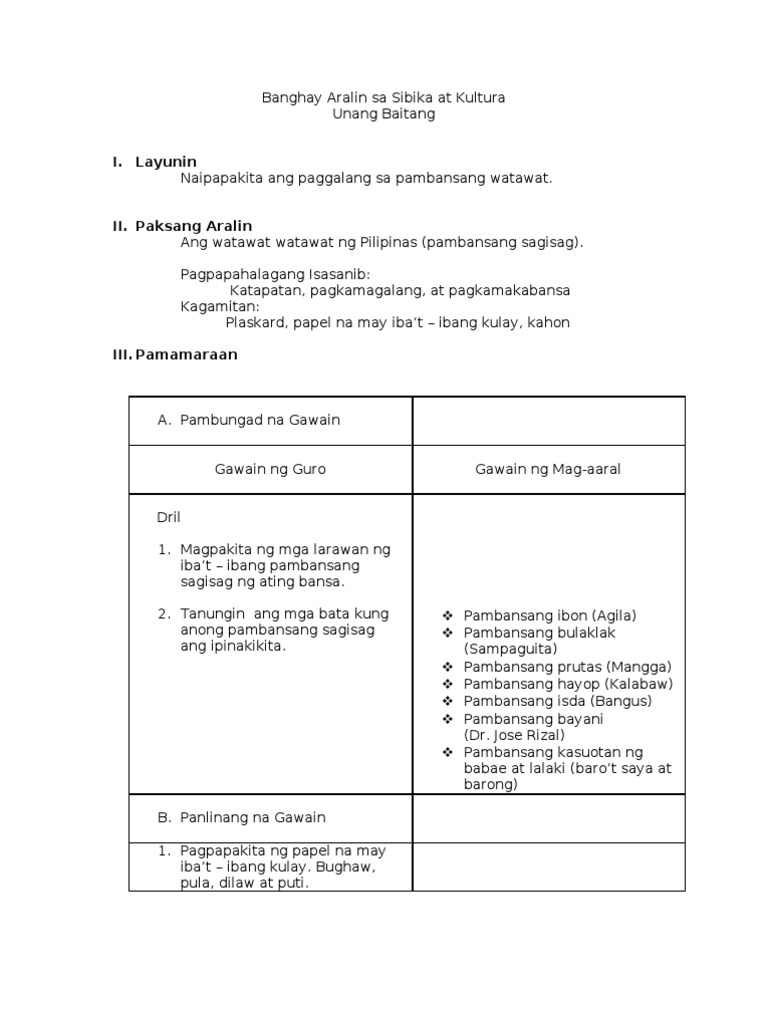 Kahulugan ng pambansang awit at watwat ng pilipinas lesson plan. Natutukoy ang mga Pambansang Sagisag ng Pilipinas. Si Marcela MariƱo de Agoncillo isang babaeng may pagmamahal sa bayan na may talento sa pananahi ang pinakiusapan ni Hen. Matatalakay mo ang kahulugan ng pambansang awit at ng watawat bilang mga sagisag ng bansa 2.