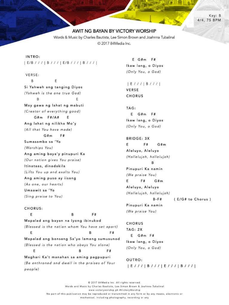 Awit ng Bayan - Victory Worship Lyrics and Chords Download button is at the bottom. Bb 44 74 bpm intro bb eb bb eb verse bb eb si yahweh ang tanging diyos bb eb may gawa ng lahat ng mabuti gm fa eb ang lahat ng nilikha moy gm f sumasamba sa yo bb eb ang aming bayay. B E Si Yahweh ang tanging Diyos B E May gawa ng lahat ng mabuti Gm F Bb E Ang lahat ng nilikha Moy Gm F Sumasamba saYo VERSE2.